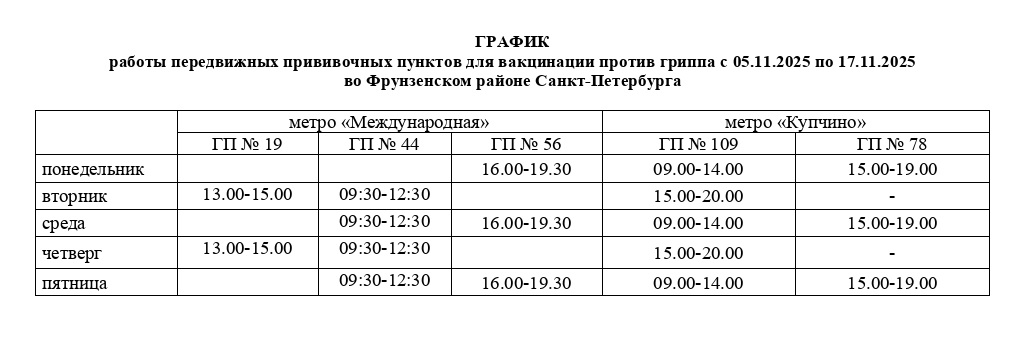 В осенний сезону во Фрунзенском районе запланировано привить против гриппа более 250 тысяч человек. Во всех поликлиниках района прививочные кабинеты работают в 2 смены. Прививочные бригады выходят в организации для вакцинации по месту работы. В детских садах и школах проводится активная вакцинация детей с согласия родителей. У станций метро «Купчино» и «Международная» работают передвижные прививочные пункты, в которых проводится вакцинация против гриппа.