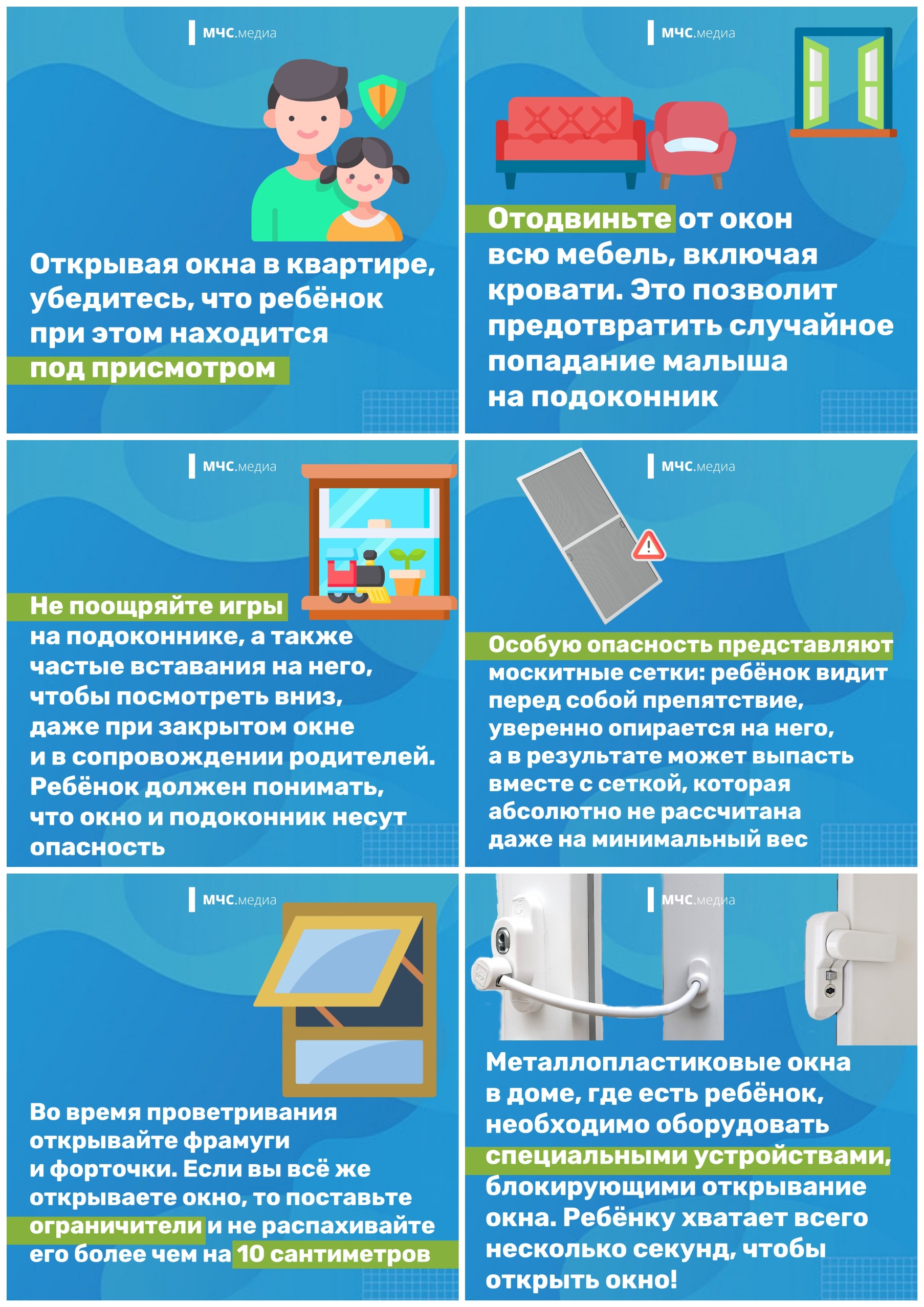 - ребенок не должен находиться без присмотра в помещении, где открыто настежь окно или есть хоть малейшая вероятность, что ребенок может его самостоятельно открыть;