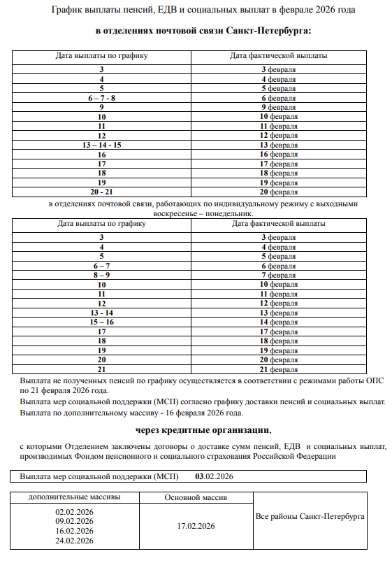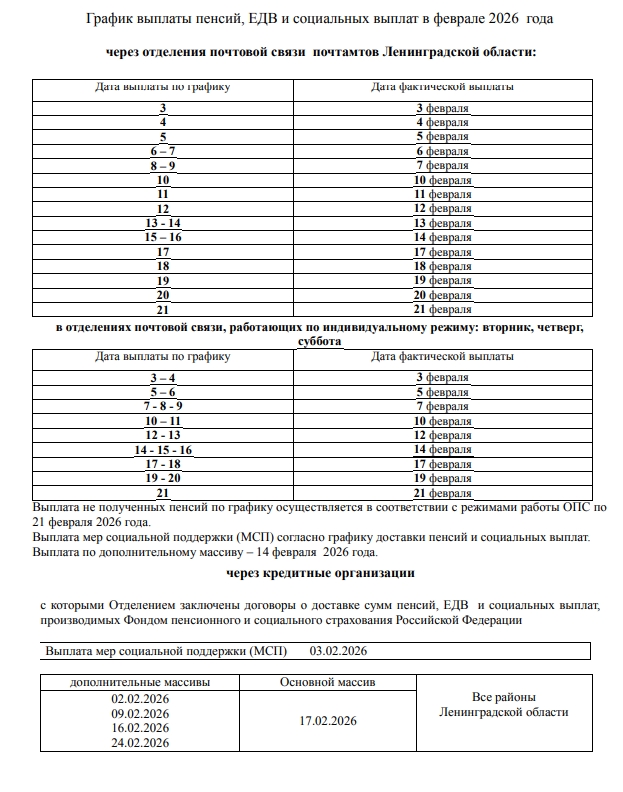 Информация Новости Отделение СФР по СПБ и ЛО График выплаты пенсий, ЕДВ и иных социальных выплат в феврале 2026 Posted on 21.01.2026 Author redactor Комментарии к записи График выплаты пенсий, ЕДВ и иных социальных выплат в феврале 2026 отключены Related posts:IV Открытый фестиваль молодежного творчества «Креатив» принимает заявки для участияУступи дорогу "спасению"!Как защитить персональные данные от мошенников