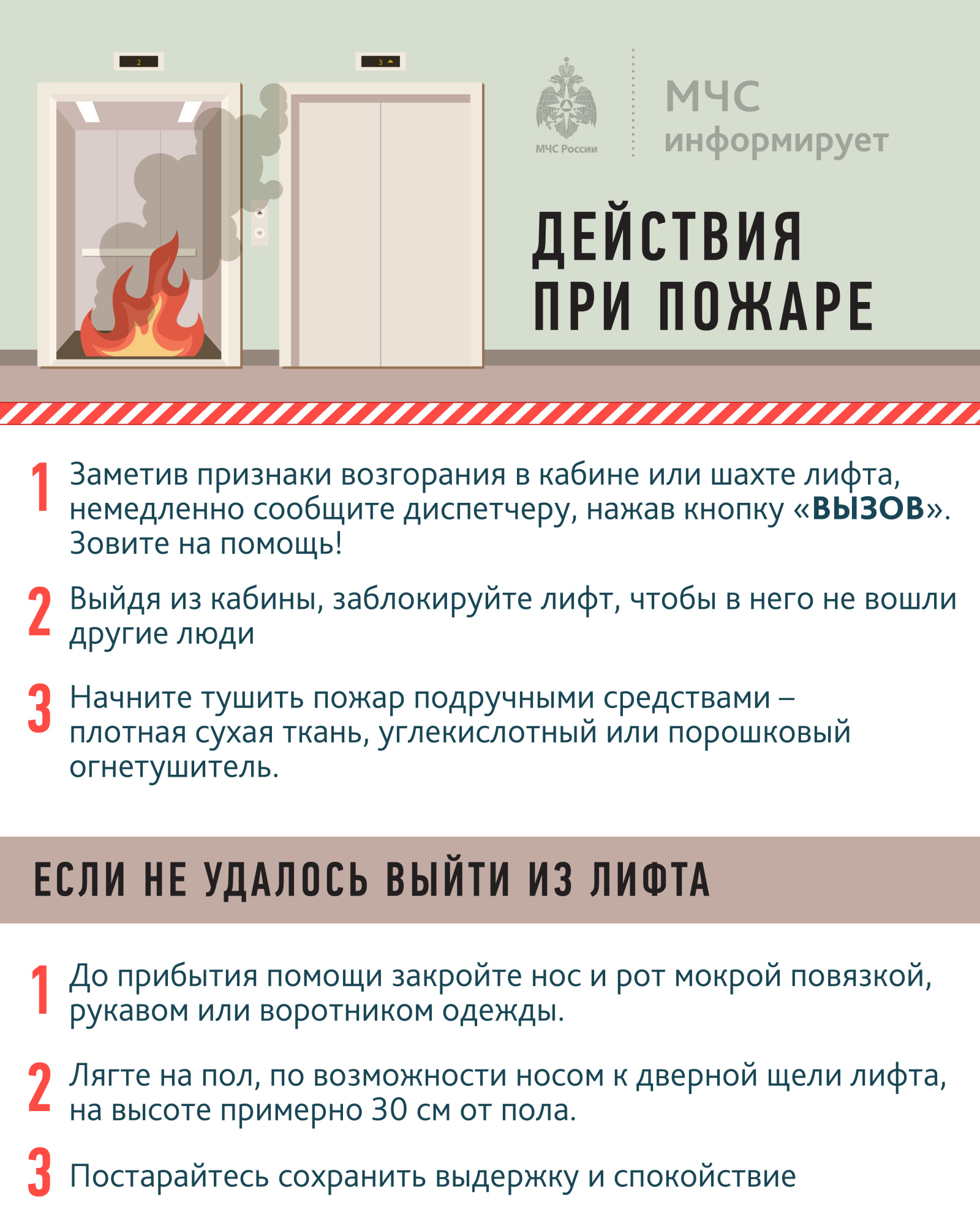 Запомните одно главное правило: в любой аварийной ситуации (пожар, землетрясение, потоп, запах гари или сильного дыма) пользоваться лифтом ЗАПРЕЩЕНО.