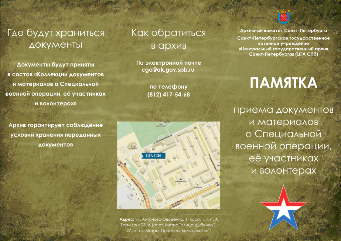 Санкт-Петербургское государственное казенное учреждение «Центральный государственный архив Санкт-Петербурга» (далее – ЦГА СПб) собирает архивные документы не только непосредственных участников специальной военной операции (далее – СВО), членов их семей и волонтеров, но и всех государственных и общественных организаций Санкт-Петербурга, а также фондов, оказывающих различную поддержку СВО и ее участникам, формируя таким образом Коллекцию.