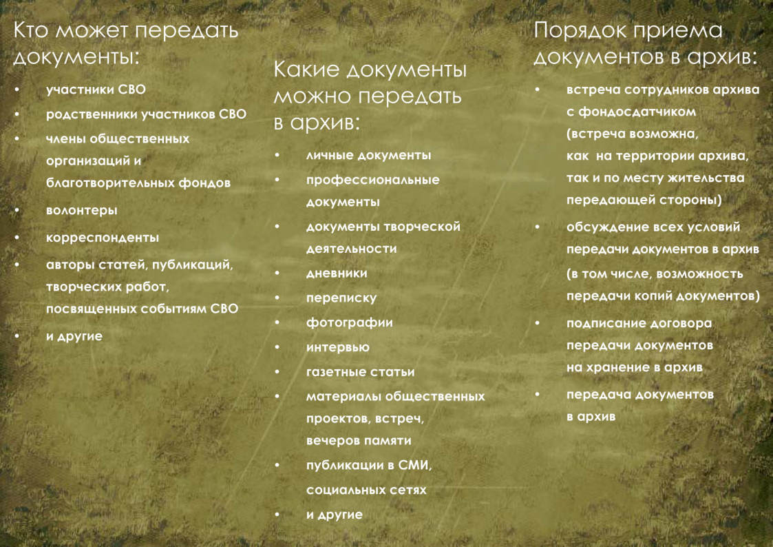 (либо их копии) на бумажных или электронных носителях, относящиеся к деятельности участников СВО: