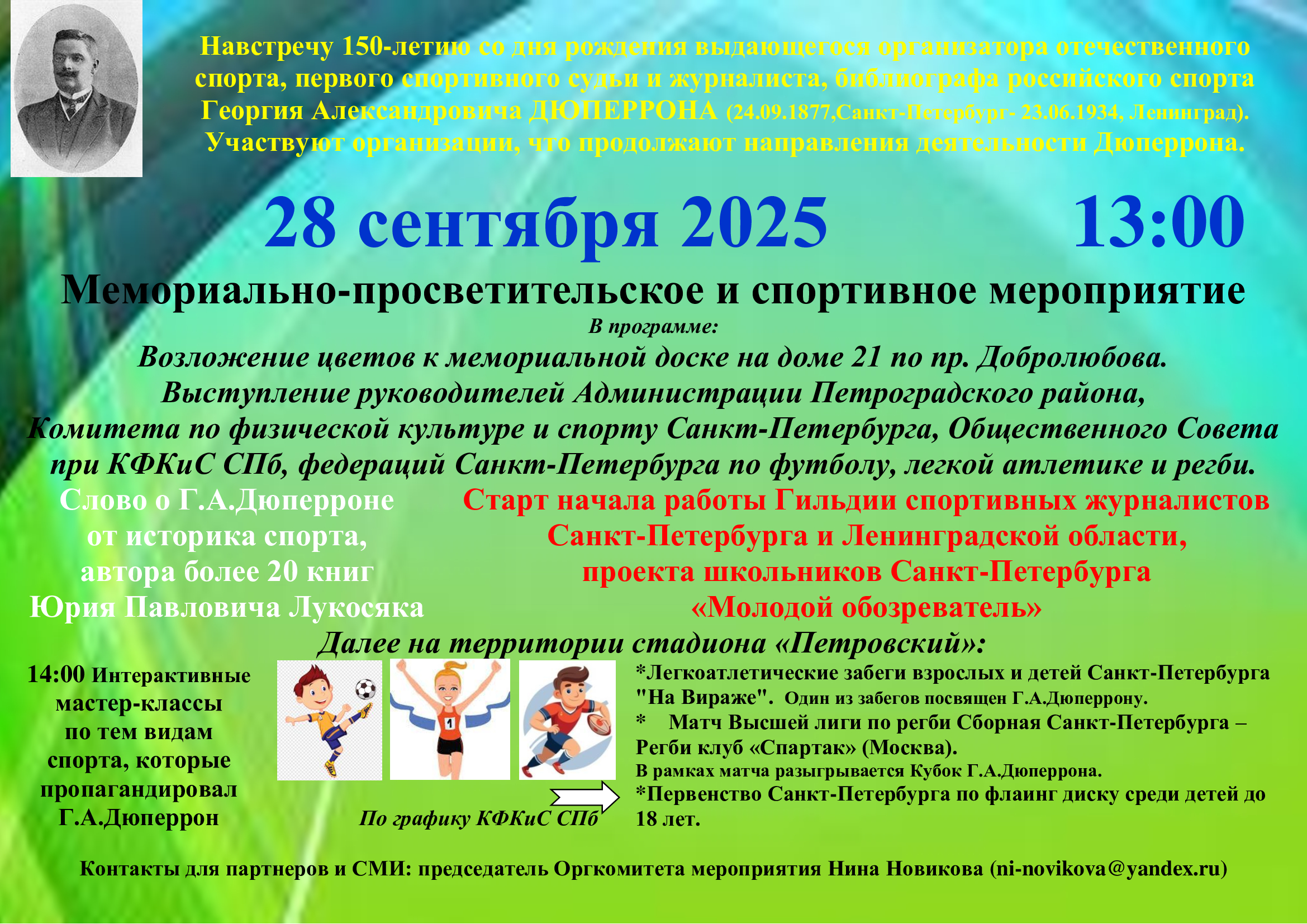 Информация Новости 28 сентября 2025 в 13:00 Мемориально-просветительное и спортивное мероприятие Posted on 29.09.2025 Author redactor Комментарии к записи 28 сентября 2025 в 13:00 Мемориально-просветительное и спортивное мероприятие отключены Related posts:ВНИМАНИЕ! РОЗЫСК!Прокуратурой Фрунзенского района г. Санкт-Петербурга проведена проверкаИнформация для потребителей Санкт-Петербургское государственное бюджетное учреждение «Центр контроля...